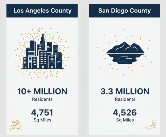 Los Angeles County covers about 4,751 square miles with more than 10 million residents. San Diego County is nearly the same size at 4,526 square miles, but holds around 3.3 million people. That population density gap matters for process servers in ways that don’t show up on a quote sheet.
